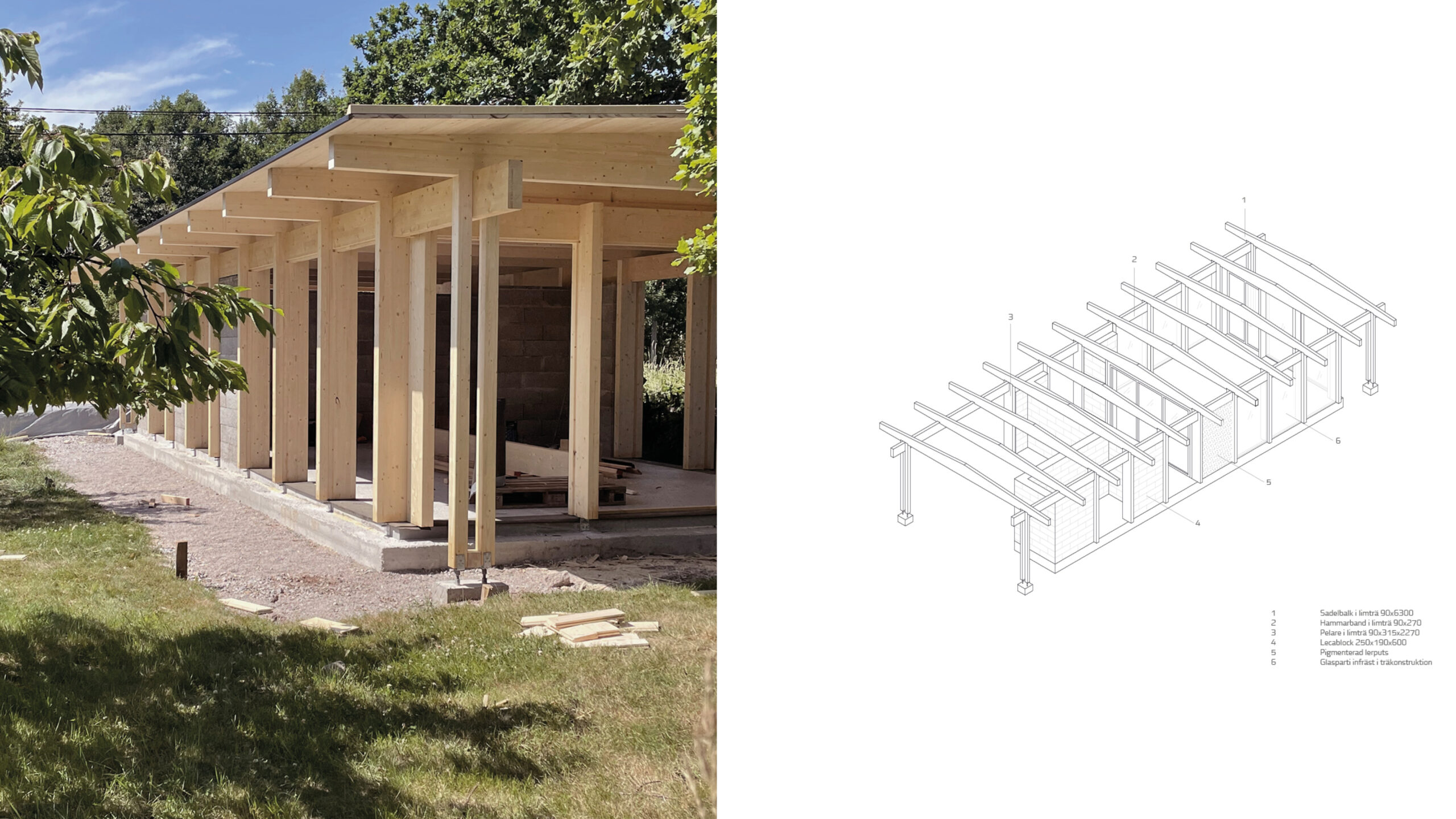 Byggnaden undersöker relationen mellan det massiva och det spröda, där mötet mellan dessa två ytterligheter bildar husets tektoniska principer. Resultatet blir en modern tolkning av ett stolpverk där den bärande träkonstruktionen av limträ följer en konsekvent upprepning, rytm och skapar förutsättningen för byggnadens funktioner och rum. Mellanrummen mellan pelare och balkar är sedan antingen öppna, glasade eller stängda i form av murade väggar.